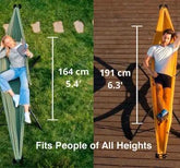 Anymaka está diseñado y probado por encima de los estándares de la industria. A diferencia de otros soportes para hamacas fabricados en acero inoxidable, Anymaka se destaca por utilizar aluminio de calidad aeronáutica para el marco. Este material reduce significativamente el peso manteniendo una resistencia y durabilidad excepcionales contra la corrosión. Junto con nuestra hamaca superresistente, hecha de tela de nailon antidesgarro de diamante 40D,soporta hasta 250 kg sin tambalearse ni tocar el suelo.
